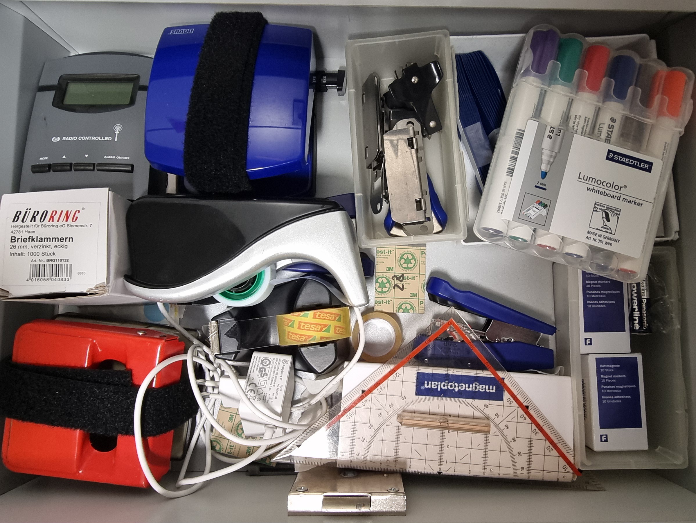 Tesa, Funkuhr, Locher, Tacker, Geodreieck, Whiteboard Marker, Magnete, Hefter, Briefklammern